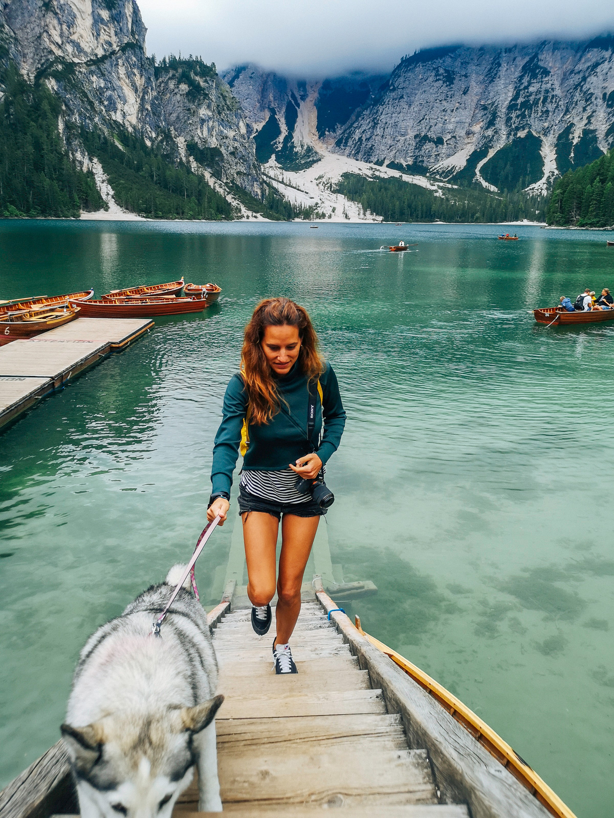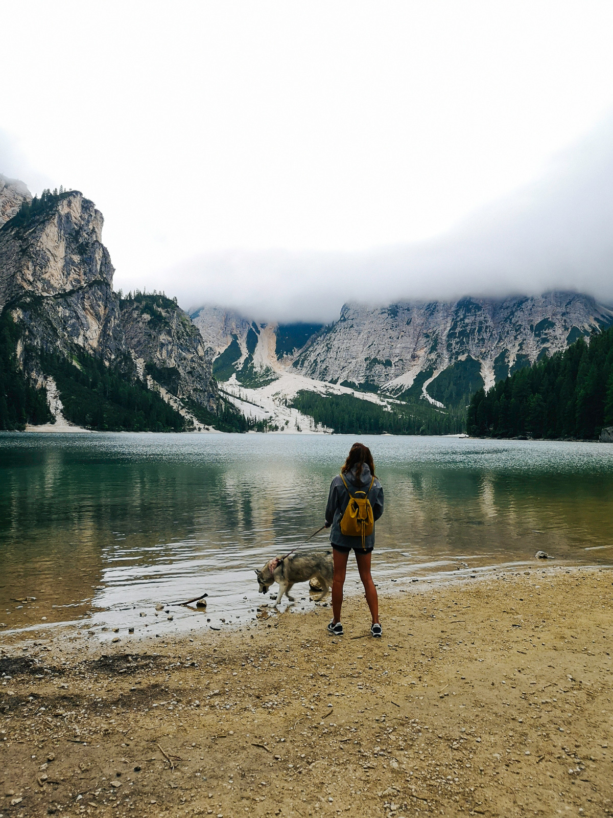 Dicen que después de la tormenta llega la calma, no? Allí estábamos nosotros con husky Eva contemplando esta joya dolomítica ubicada en el corazón del parque natural Fannes-Sennes y Braies, prácticamente solos, gozándolo. Además las nubes seguían cubriendo parte de las montañas y ofreciendo al paisaje un punto diferente, más pintoresco aún.