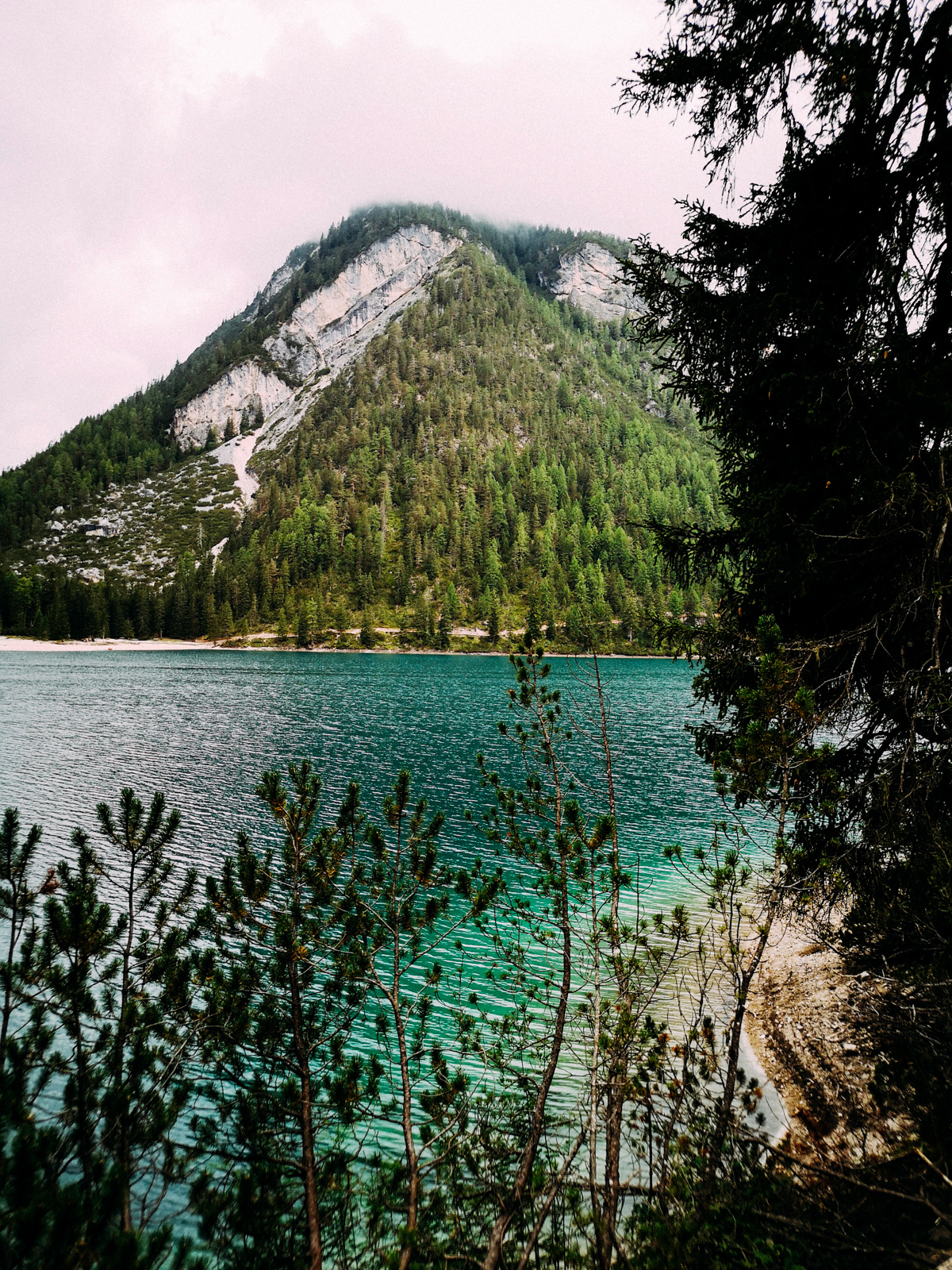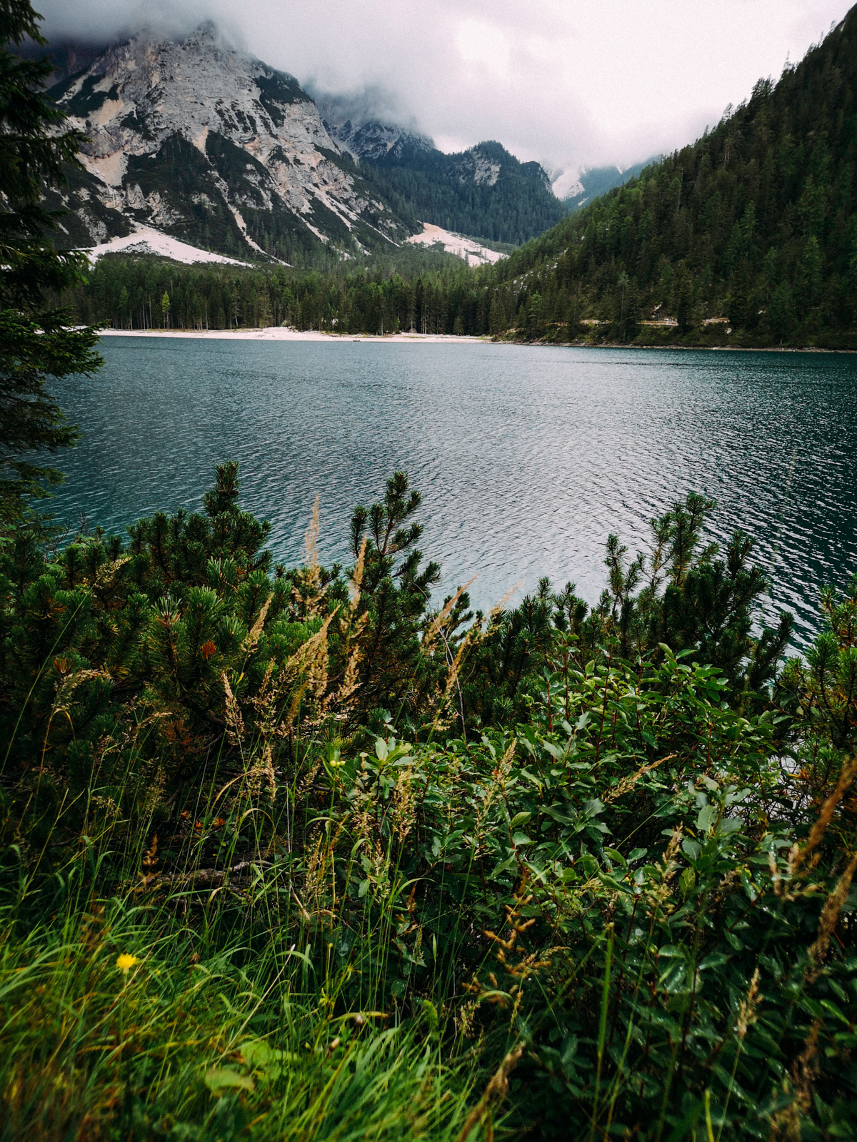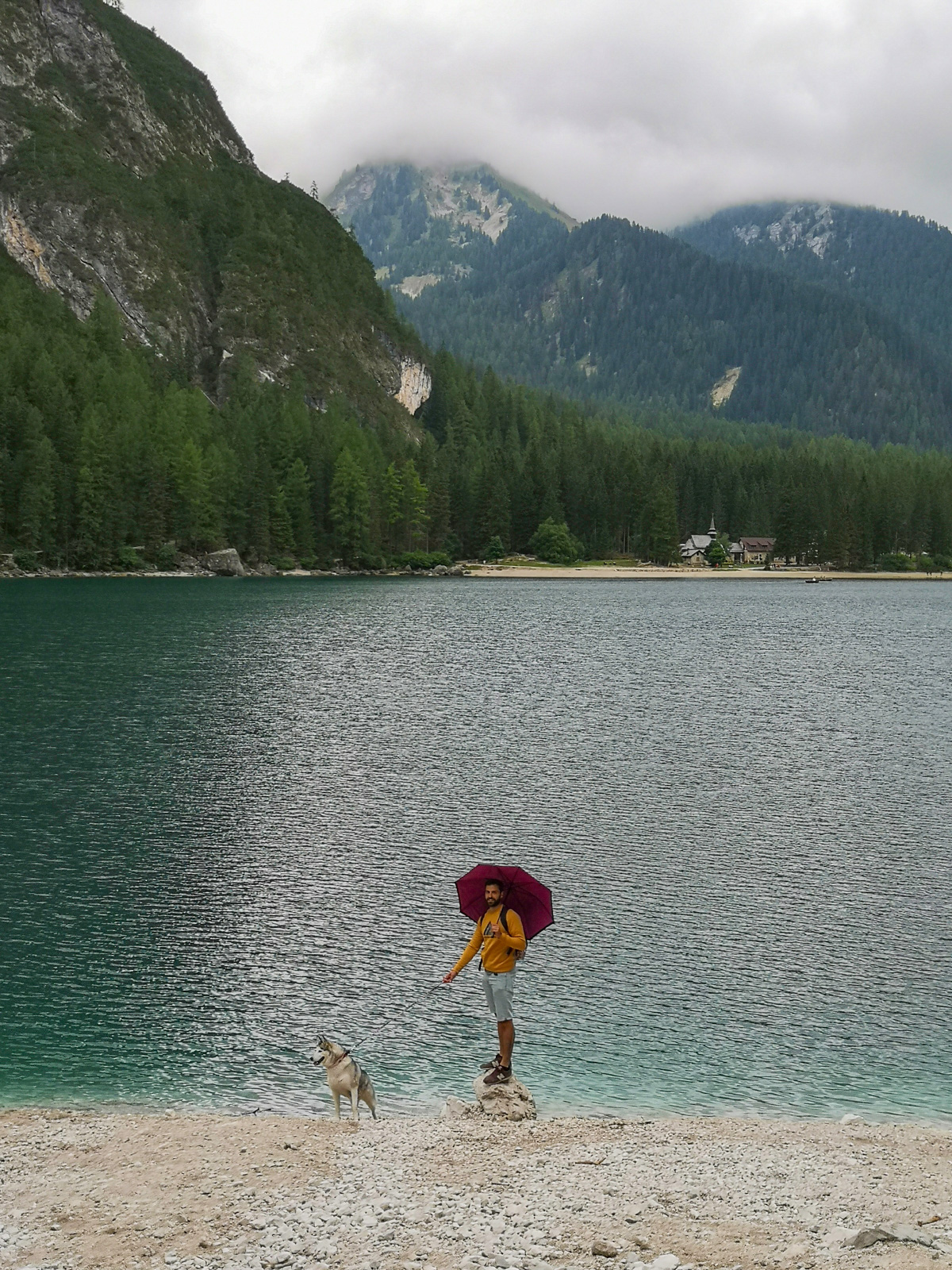 Llegamos al lago en un día tonto de mediados de agosto, de esos en los que el cielo se encapota y unas nubes grises bien densas hacen que a la una de la tarde te entren ganas de meterte en la cama, pero es lo que tiene la montaña. El tiempo nos había dado tregua durante la mañana que aprovechamos para hacer una excursión preciosa en el Paso Pordoi, y fue después de comer, cuando pusimos rumbo al Lago Di Braies. Como a media hora del destino atravesamos una tormenta brutal. De hecho, durante los últimos kilómetros había bastante atasco en el carril de vuelta, mientras que por el nuestro conducíamos solos.